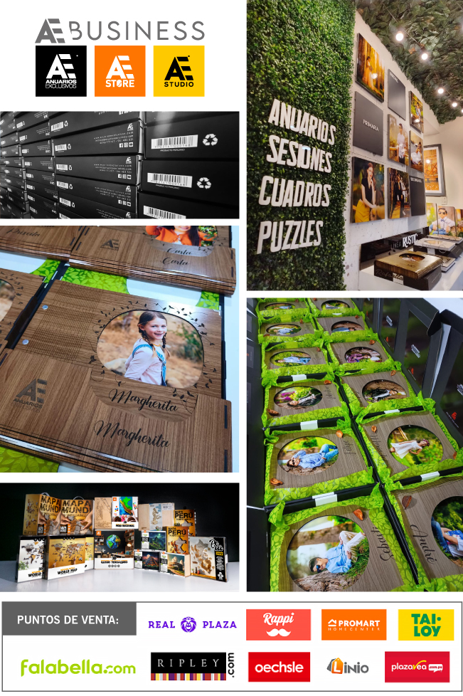 AE BUSINESS se especializa en la creación de anuarios escolares únicos y exclusivos en el mercado peruano bajo la marca registrada de ANUARIOS EXCLUSIVOS y en la fabricación de rompecabezas de madera educativos para todas las edades, bajo la marca AE STORE.